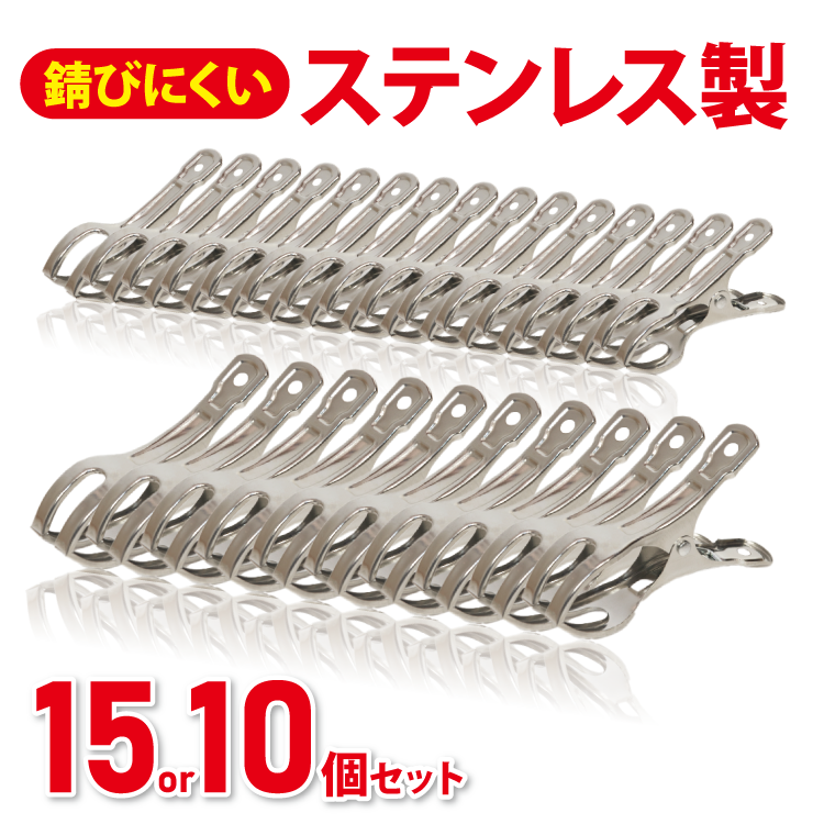 | 特徴 | ・ステンレス製で高強度・高耐久な洗濯ばさみです。お好みに合わせて2種のサイズからお選びいただけます。 ・頑丈なステンレス構造なので重たい衣服や布団をしっかり固定します。強風時の吹き飛ばしや落下も心配不要です。 ・プラスチック製とは違って頑丈な作りなので日光・雨・紫外線で変形したりせず、劣化が少ないため長くお使いいただけます。 ・クリップの先端にまるみをつけてあるので、はさんだ時に引っかかったりせず衣服を傷めません。 ・ステンレス素材で錆びにくいから屋外での使用も安心です。 ・くぼみに指がしっかりはまって滑りにくい設計のため、ワンタッチで簡単に開閉出来、毎日快適にお使いいただけます。 ・洗濯用に作られた洗濯ばさみですが、強力なクリップなので多用途で使用可能です。シューズ干し・ボトルクリップなど色々な場面で活躍します。 ・シルバーでおしゃれなデザインなので見た目にもすっきりお使いいただけます。 |