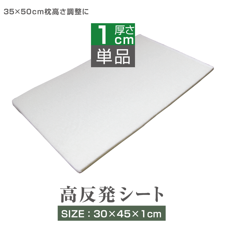 | 特徴 | ・お手持ちの枕にプラスするだけのかんたん高さ調整シート! ・高反発は硬いわけじゃありません。反発力があるんです! 触ると柔らかく感じるかもしれませんが、 掴むのと頭を乗せるのでは、感覚がだいぶ違います。 頭を乗せて寝てみると、弾力を感じて頂けると思います。 ・高反発の適度な反発力で、物足りなかった枕も大満足♪ ・高反発シートは高品質マットレスと同等の密度「40D」を採用 しているので優れた耐久性を持っています。 ・補充の必要なパイプなどとは違い、 枕の下に敷くだけなので簡単に高さ調節して頂けます。※滑り止めは付いておりませんので、 床や椅子の上ご使用の際は注意をお願い致します。 |