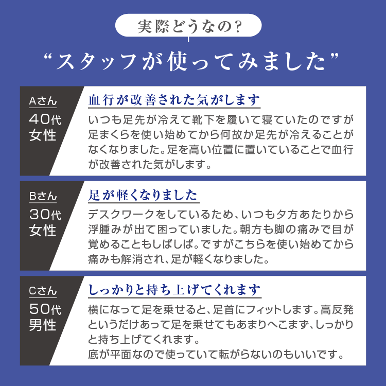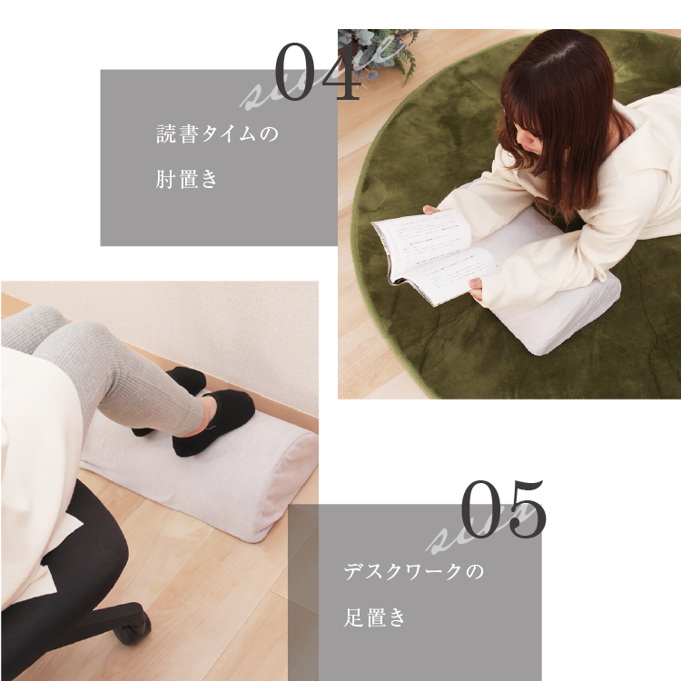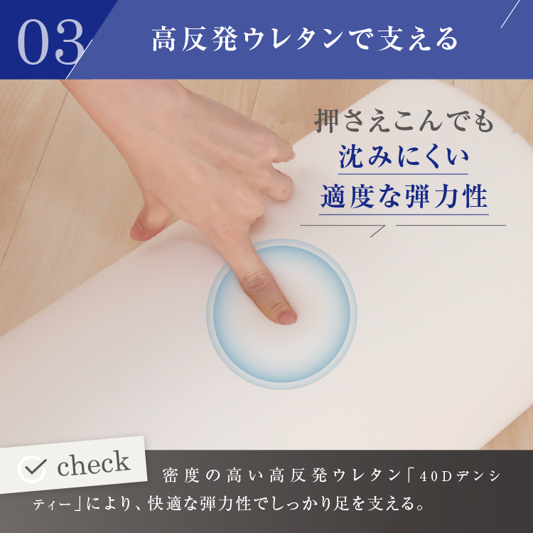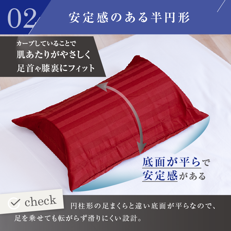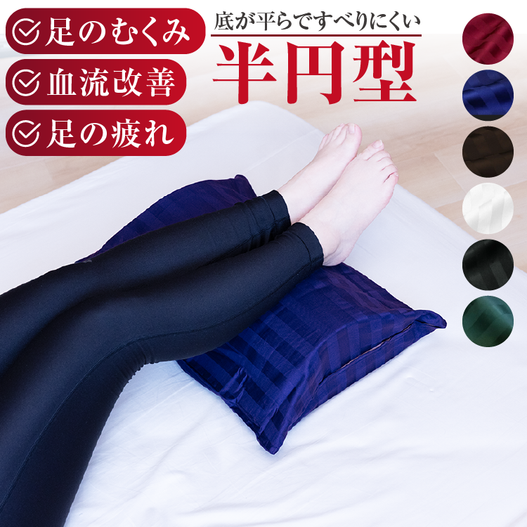 | 特徴 | ・転がりやズレが起きにくい半円タイプの高反発足枕です。 ・立ち仕事や歩くことが多い方、デスクワークの方などにおすすめです。 ・足を高くし水分の循環サポートや血流改善をすることによりむくみ、足の疲労感などを軽減します。 ・反り腰改善や腰痛の対策としても役立ちます。 ・高反発素材は低反発のものやビーズなどと比べ、体圧を分散したり熱が籠りにくいので長時間快適にお使いいただけます。 ・足以外にも腰当て、アームレストやフットレスト、抱き枕など様々な使い方をして頂けます。 ・転がらないのでストレッチポールとしても安全にお使いいただけます。 ・付属のカバーには安心の日本製・綿100%・防ダニ・洗濯OKの生地を採用しました。 ・肌刺激の少ないさらりとしたサテン織りの生地なのでお肌の弱い方にも快適にお使いいただけます。 |