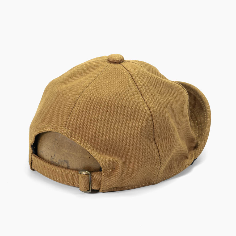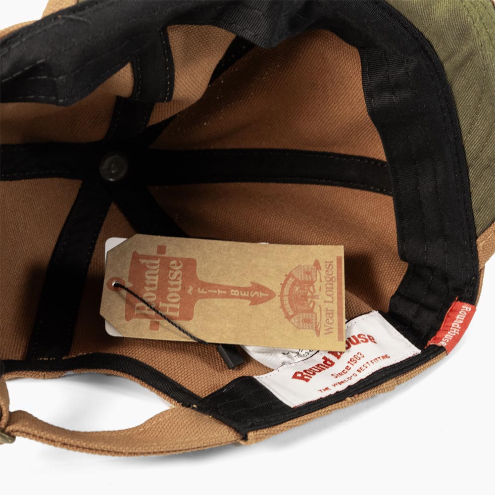 アメリカワークブランドROUND HOUSEのキャンバス&デニムアンパイアキャップ。サイズ調節機能で大きいサイズから小さいサイズまで対応。