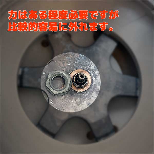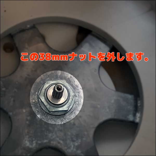 家庭用縦型洗濯機の修理・分解、クリーニングで洗濯脱水槽の取り外しが必要時に大型のフランジナット(トクナ)を解くのに必須の工具、ハンマーレスフランジナット外しです。ハンマーもしっかりと重量があるので強い打撃で分解できます。