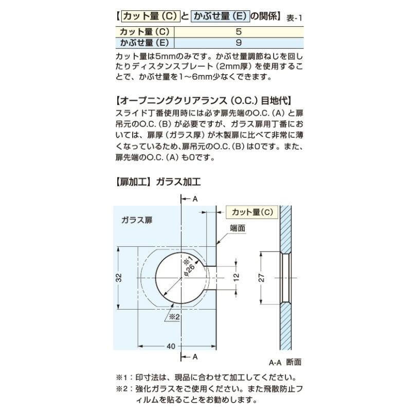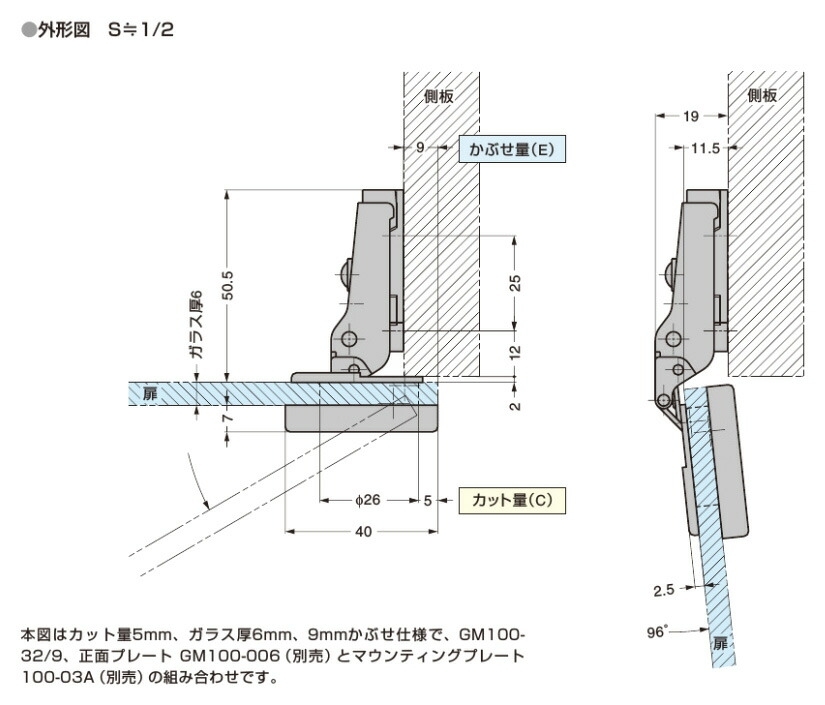 ガラス扉用。96°開き。9mmかぶせ。