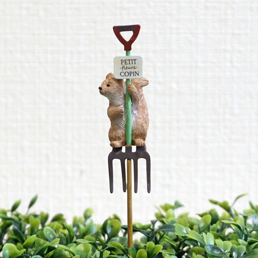 見ているだけで心が和む、キュートなりすが主役のガーデンピック!愛らしい表情のりすが、小さな看板とガーデンフォークにちょこんと乗った、遊び心あふれるデザインです。ガーデンフォーク型になっているのもポイント。看板に書かれた「PETIT FLEURS COPIN(小さな花 仲間)」の文字が、ナチュラルで優しい雰囲気を添えます。ベランダガーデニングや小さな鉢植えにも最適です。お庭に物語を添える、とっておきのアイテムとしていかがでしょうか。内容 1本サイズ 約 幅25mm×奥行25mm×高さ78mm(全体135mm)素材 レジン・アイアン注意事項■写真内の花瓶・小物等は商品に含まれません。■デザイン上、ややラフな仕上げになっています。傷や塗装ムラ、塗装の垂れなどが見受けられますが商品の特性のため予めご了承ください。■手作りの商品につき、サイズ・色・配置等の状態が多少異なります。あらかじめご了承ください。■製造工程上、色合い、風合い等に多少の個体差があります。■ペイント仕上げの商品は直射日光、屋外での使用の場合色落ち、変色することがあります。■商品写真はできる限り実物の色に近づけるよう加工しておりますが、お客様が使用するパソコンのモニター設定や部屋の照明により多少、色の変化が感じられる場合がございます。