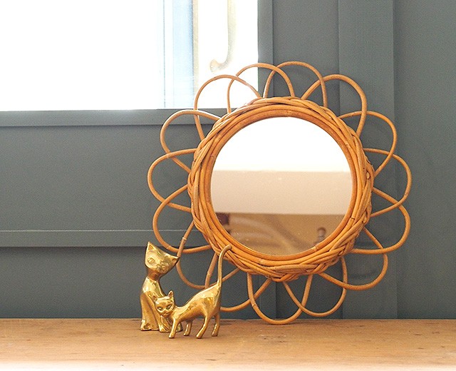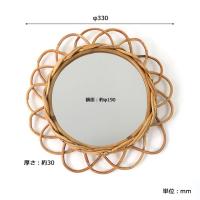 ヨーロッパの蚤の市でみつけたような風合いと優しい印象に感じるフラワーミラー。サイズも小さ目でエントランスなどのお出かけ前の身だしなみチェックや、デスクに立て掛けて毎日のお化粧にお使い頂いたりできます。とってもかわいい印象でお部屋のインテリアとしても引き立つミラーです。 裏面には壁掛け金具が付いています。 籐の一種で希少価値の高い素材。 黒い斑点や色味の違いはラタンの特徴で、一つ一つの表情を楽しんで下さい。