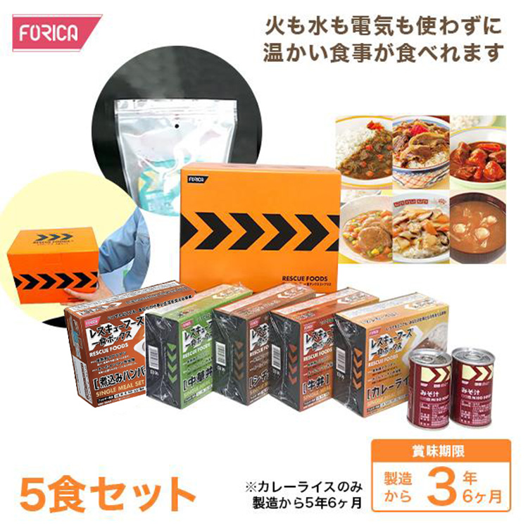 | セット内容 | レスキューフーズ一食ボックス 5種(カレーライス、牛丼、シチュー&ライス、 中華丼、煮込みハンバーグ&ライス)各1個、 、みそ汁2個 |