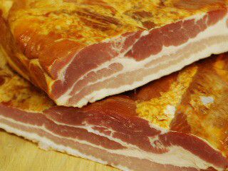 画像は2ブロックです。1ブロックが1キログラムの商品です。原料の豚バラ肉の形をそのまま造るので、非常に商品のサイズにバラツキがございます。