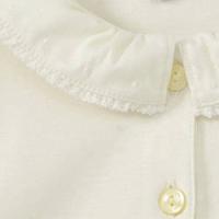 | えりまわりの繊細なレースが清楚なブラウスです☆ ギャザーを入れたえり元のデザインがオシャレですね♪ えりまわりの控えめな刺繍使いもステキですよ☆ 前のふたつボタンで止めてますので、外して着用していただけます。 柔らかなスムース素材で、適度に伸縮性があって着やすくて ジャンパースカートなどのインナーにもピッタリ♪ ちょっとしたお出かけやおよばれにも 着まわせそうなシンプルさも重宝しますよ◎