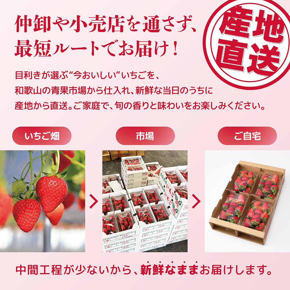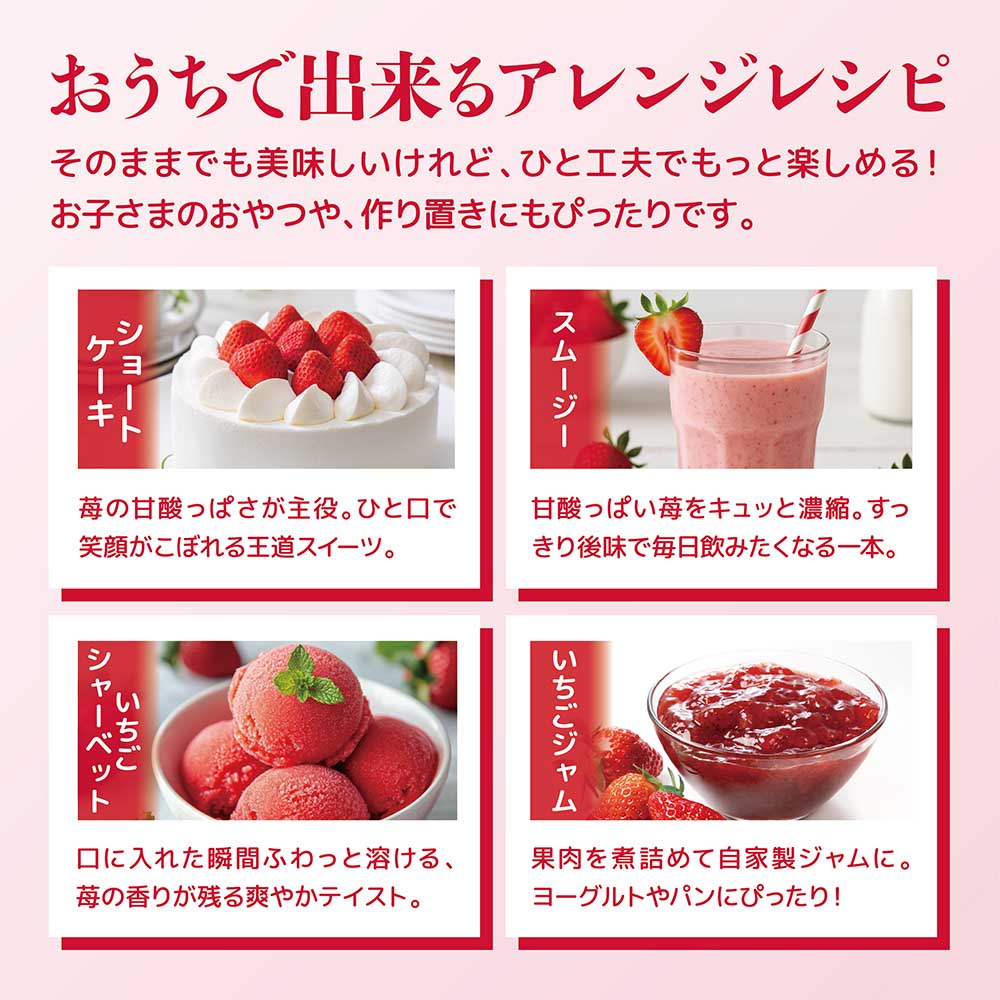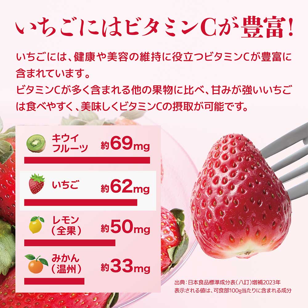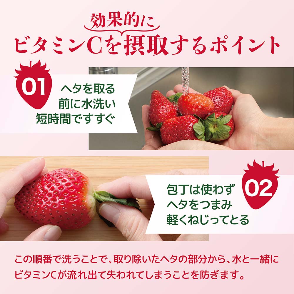【豊富なビタミンC】いちごには、健康や美容の維持に役立つビタミンCが豊富に含まれています。ビタミンCが多く含まれる他の果物に比べ、甘みが強いいちごは食べやすく、美味しくビタミンCの摂取が可能です