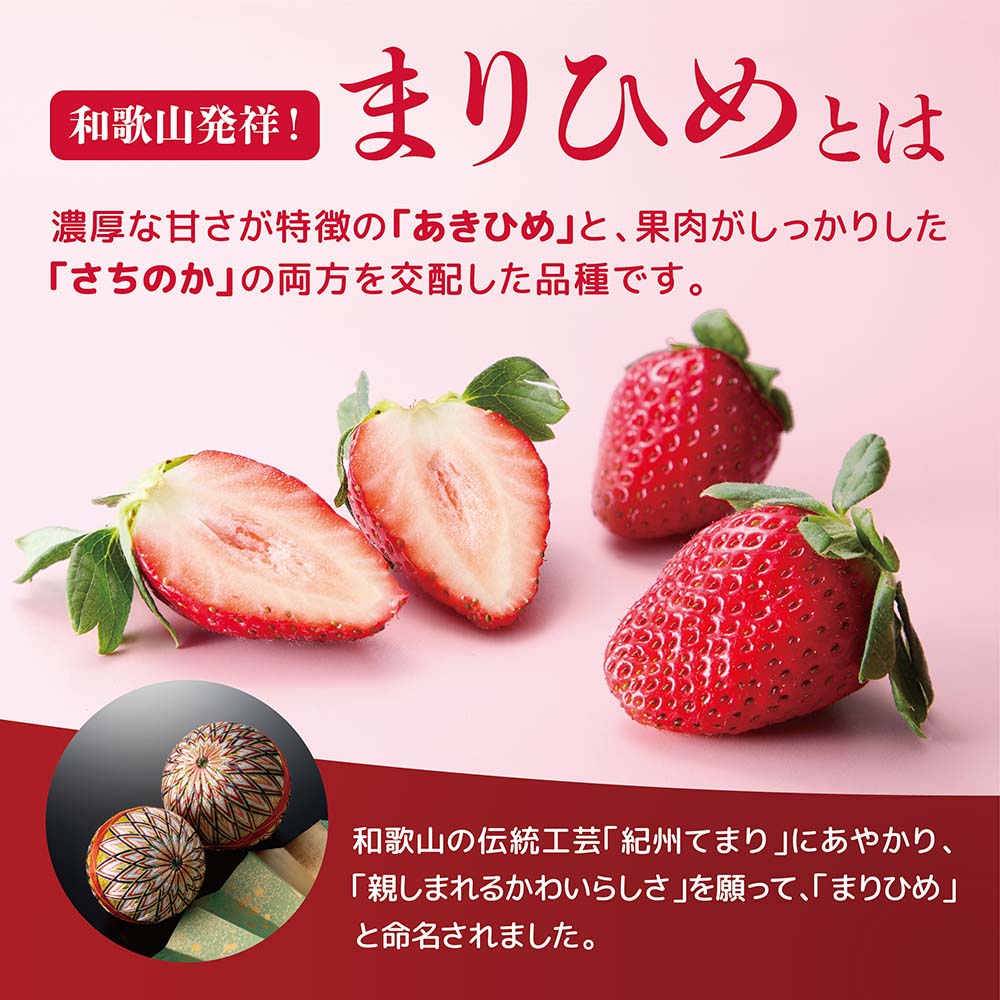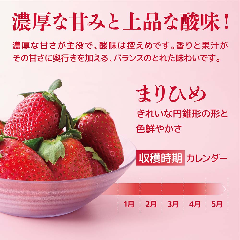 しっかりした果肉に、濃厚な甘さが特徴の「まりひめ(いちご)」です。香りと果汁がその甘さに奥行きを加える、バランスのとれた味わいです