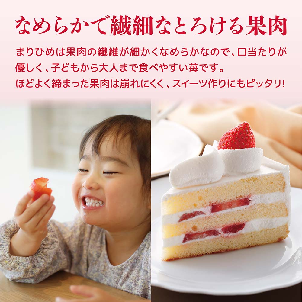 【とろける果肉】まりひめは果肉の繊維が細かくなめらかなので、口当たりが優しく、子どもから大人まで食べやすい苺です