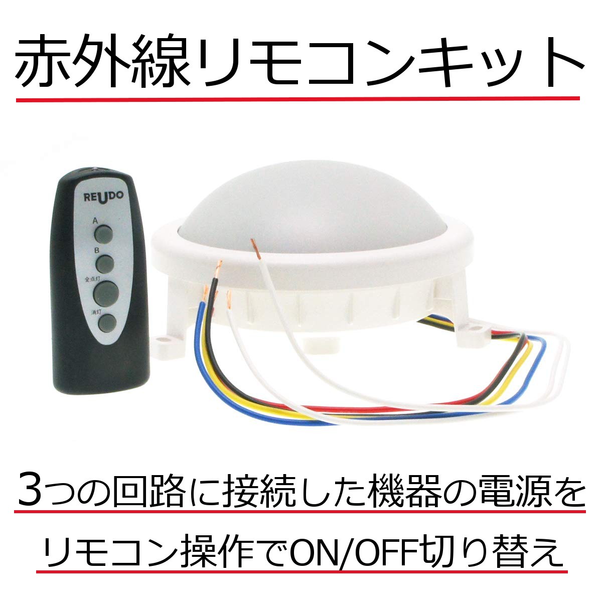 3つの回路に接続した機器の電源を、遠隔でON/OFFすることができるリモコンキット。