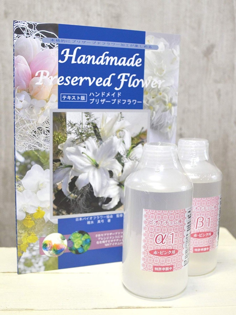 初心者におすすめ!書籍+花の色が残せるプリザ加工液セット。【内容】新刊「生花から自分で作る手作りのプリザーブドフラワー」(ビオナチュレ他溶液等の本)と、α500cc1本β500cc1本の計2本セット。[α1+β1:主に赤・ピンク系の花。バラ、チューリップ、ハス、シンビジウム、ダリア、トルコキキョウ、ヒマワリ、ケイトウ、カラー等。] [α2+β2:主に青・紫系の花。バラ、デンファレ、デルフィニウム、リンドウ、コニファー、トルコキキョウ、ブルースター、菊のステム等。]※花の色や種類によっては色が元より多少変わる場合有り。
