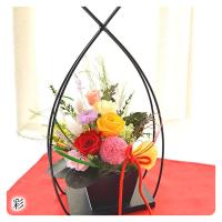 花材:【プリザーブドフラワー】バラ、ポンポン菊、小菊、アジサイ、レモンリーフ、ツリーファン、グラビア、ソリダコ、プベッセンス、ポアプランツ(又はラグラス)、ベアグラス等。