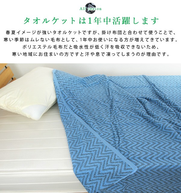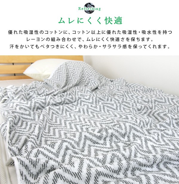 軽くて重苦しくなく、コットンもレーヨンも天然繊維なのでお肌のデリケートな方もお子様も安心。春夏だけでなく、寒い季節も掛け布団と合わせて使うことで、ムレない毛布としてオールシーズンお使いいただけます。