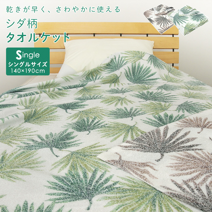 タオルケット シングル シダ柄 140×190cm 夏掛け 肌掛け 涼感 吸水 通気性 速乾 薄手 洗える パイルケット ブランケット ボタニカル リーフ エスニック