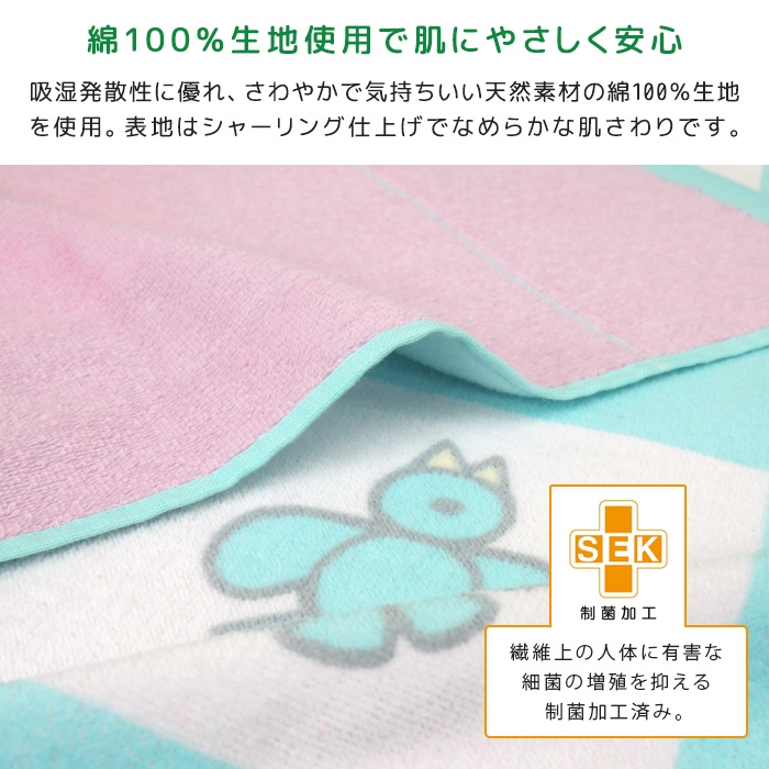 肌にやさしい綿100%素材、表地はシャーリング加工し気持ちいいなめらかな肌さわりです。繊維に付着した菌の増殖を防ぐ"制菌加工"をプラスしました。