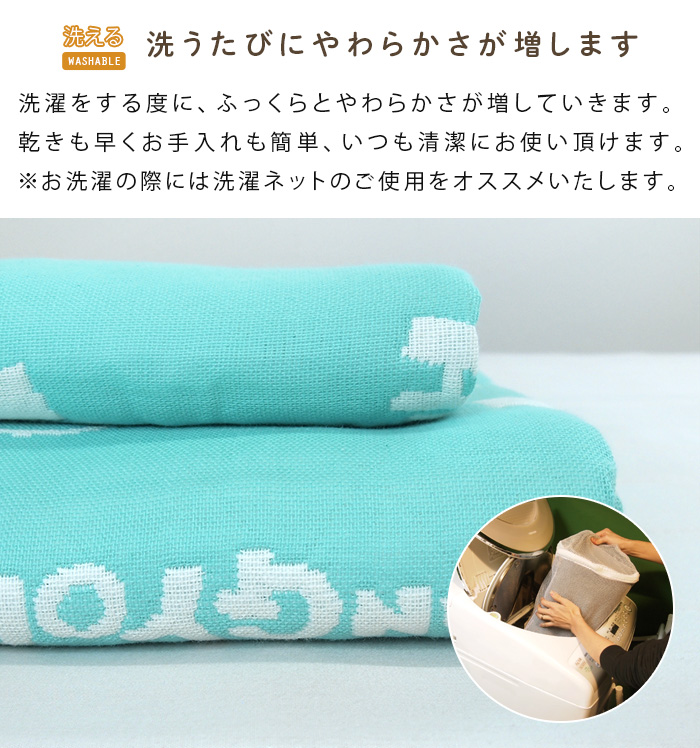 肌にあたる面は綿100%、中層にポリエステルを使用した3重ガーゼ。吸湿性と放湿性の良さで、汗をかいてもさらっとした肌触りが続きます。そして洗濯を繰り返す毎にふっくらとやわらかさが増していきます。