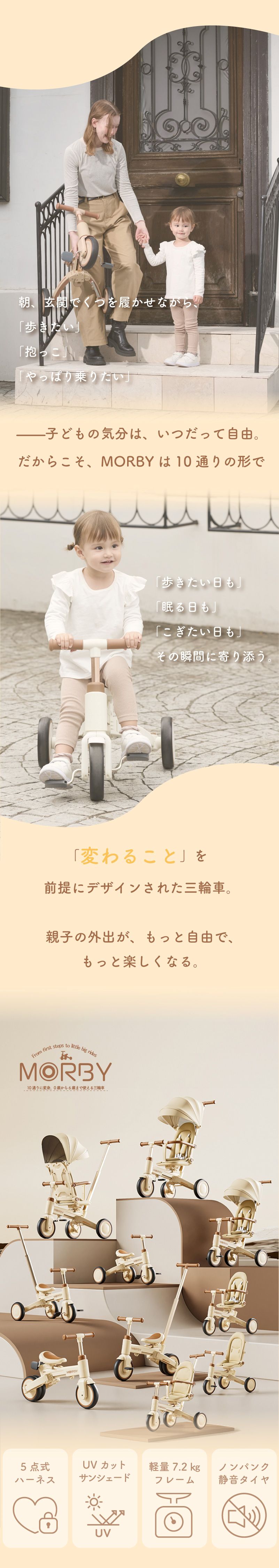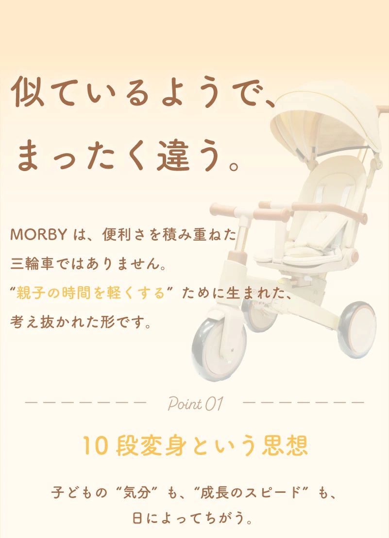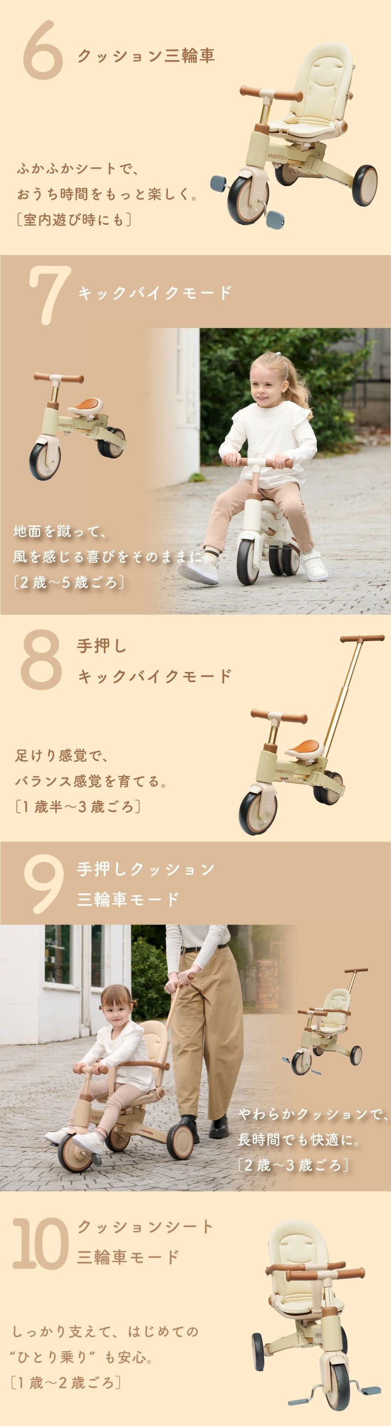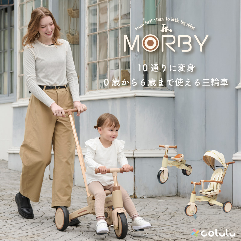 | 商品詳細 | colulu MORBY モルビー 三輪車 10通りに変身!0歳から6歳まで使える三輪車 「変わること」を前提にデザインされた三輪車。 親子の外出が、もっと自由で、もっと楽しくなる。 【point1 10段変身という思想】 子どもの"気分"も、"成長のスピード"も、日によってちがう。 多機能を詰め込むためではなく、"自由"を守るために変わる。 【point2 安心して押せる操作性】 しっかりハンドルが効くから、行きたい方向にちゃんと進める。 【point3 感性で選ばれるデザイン】 インテリアのように穏やかに寄り添うフォルムと色。 家でも外でも、自然体のままに使えるデザインです。 【point4 6ヶ月〜6歳まで、ずっと寄り添う】 「成長に合わせて“変える”」ではなく、「成長を”一緒に過ごす”」。 長く使うからこそ感じられる”思い出の積み重ね”が、 morbyの価値そのものです。 【point5 簡単にモードチェンジ】 初めてでも安心! 【主な仕様】 ・カラー ベージュ、グレージュ、ホワイト、ブラック ・サイズ 手押し三輪車(サンシェード付き):高さ95cm×幅47cm×奥行85cm キックバイクモード:高さ57cm×奥行70cm ・本体重量 約7.2kg ・耐荷重 25kg ・対象年齢 6ヶ月〜6歳頃まで 【保証期間】 購入日から1年間 30日間返品対応 |