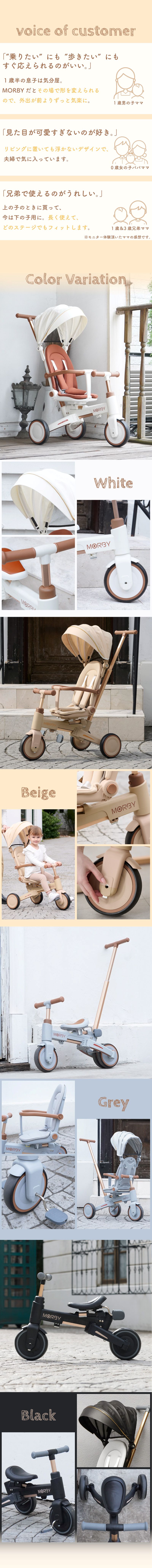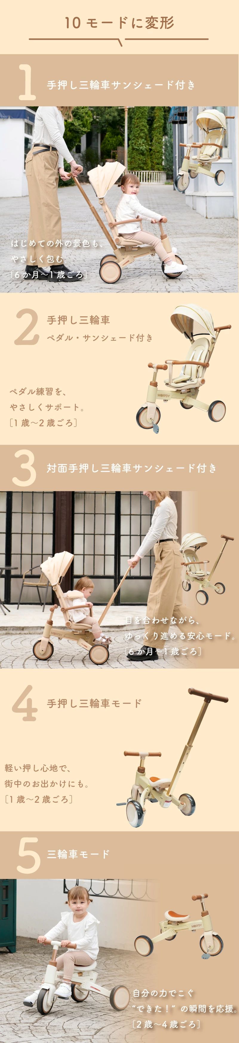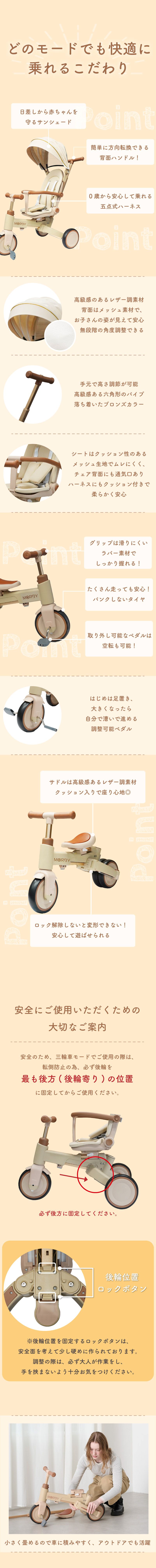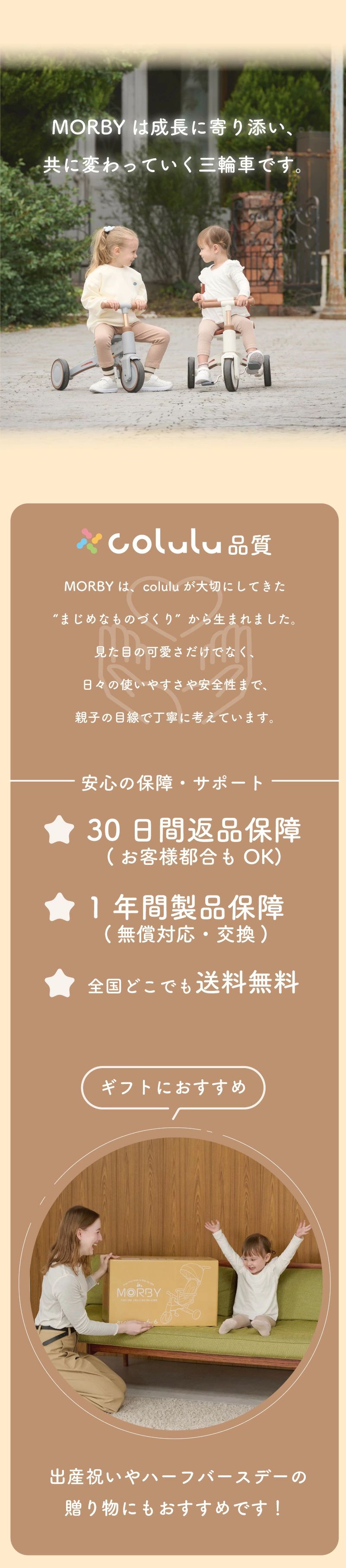 | 商品詳細 | colulu MORBY モルビー 三輪車 10通りに変身!0歳から6歳まで使える三輪車 「変わること」を前提にデザインされた三輪車。 親子の外出が、もっと自由で、もっと楽しくなる。 【point1 10段変身という思想】 子どもの"気分"も、"成長のスピード"も、日によってちがう。 多機能を詰め込むためではなく、"自由"を守るために変わる。 【point2 安心して押せる操作性】 しっかりハンドルが効くから、行きたい方向にちゃんと進める。 【point3 感性で選ばれるデザイン】 インテリアのように穏やかに寄り添うフォルムと色。 家でも外でも、自然体のままに使えるデザインです。 【point4 6ヶ月〜6歳まで、ずっと寄り添う】 「成長に合わせて“変える”」ではなく、「成長を”一緒に過ごす”」。 長く使うからこそ感じられる”思い出の積み重ね”が、 morbyの価値そのものです。 【point5 簡単にモードチェンジ】 初めてでも安心! 【主な仕様】 ・カラー ベージュ、グレージュ、ホワイト、ブラック ・サイズ 手押し三輪車(サンシェード付き):高さ95cm×幅47cm×奥行85cm キックバイクモード:高さ57cm×奥行70cm ・本体重量 約7.2kg ・耐荷重 25kg ・対象年齢 6ヶ月〜6歳頃まで 【保証期間】 購入日から1年間 30日間返品対応 |