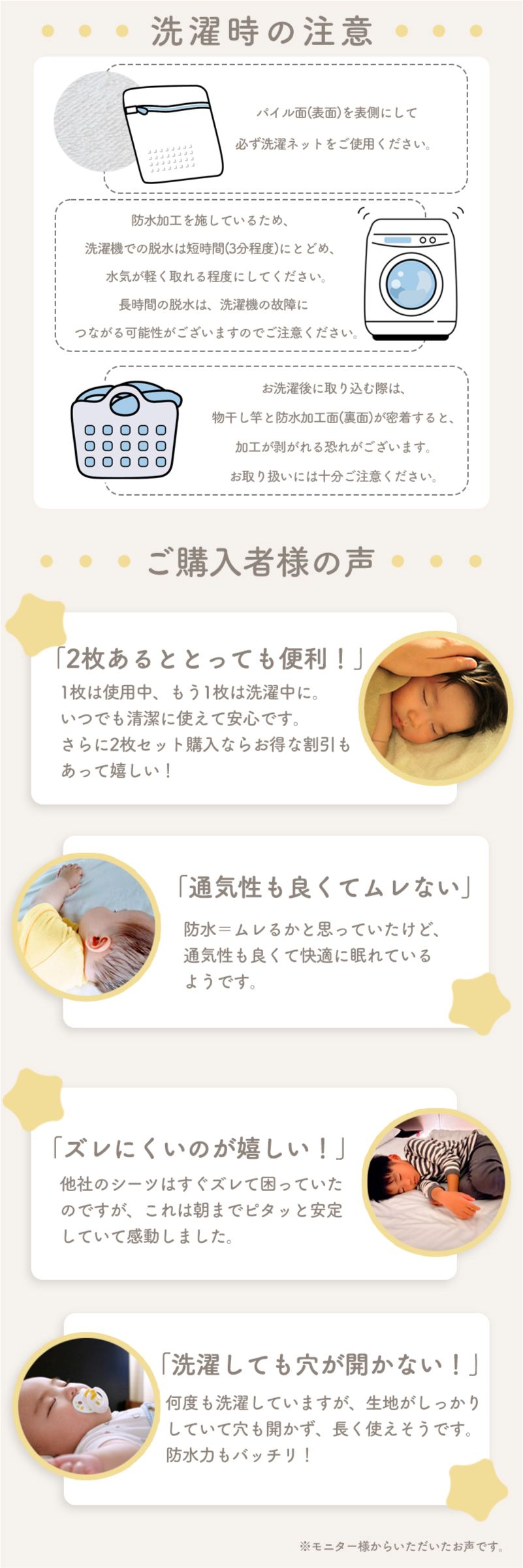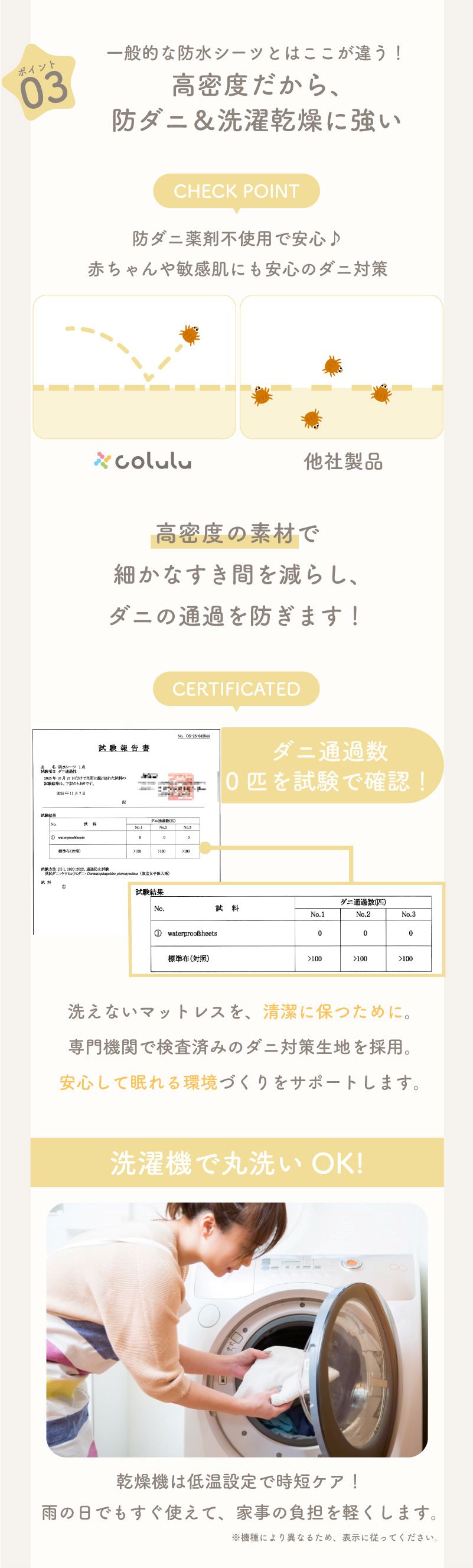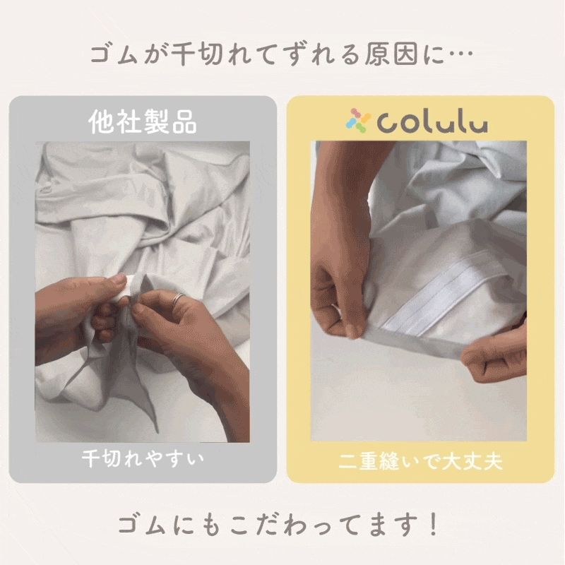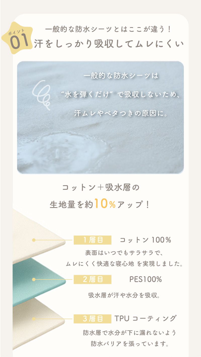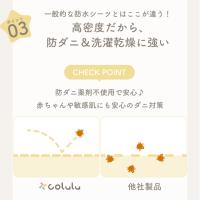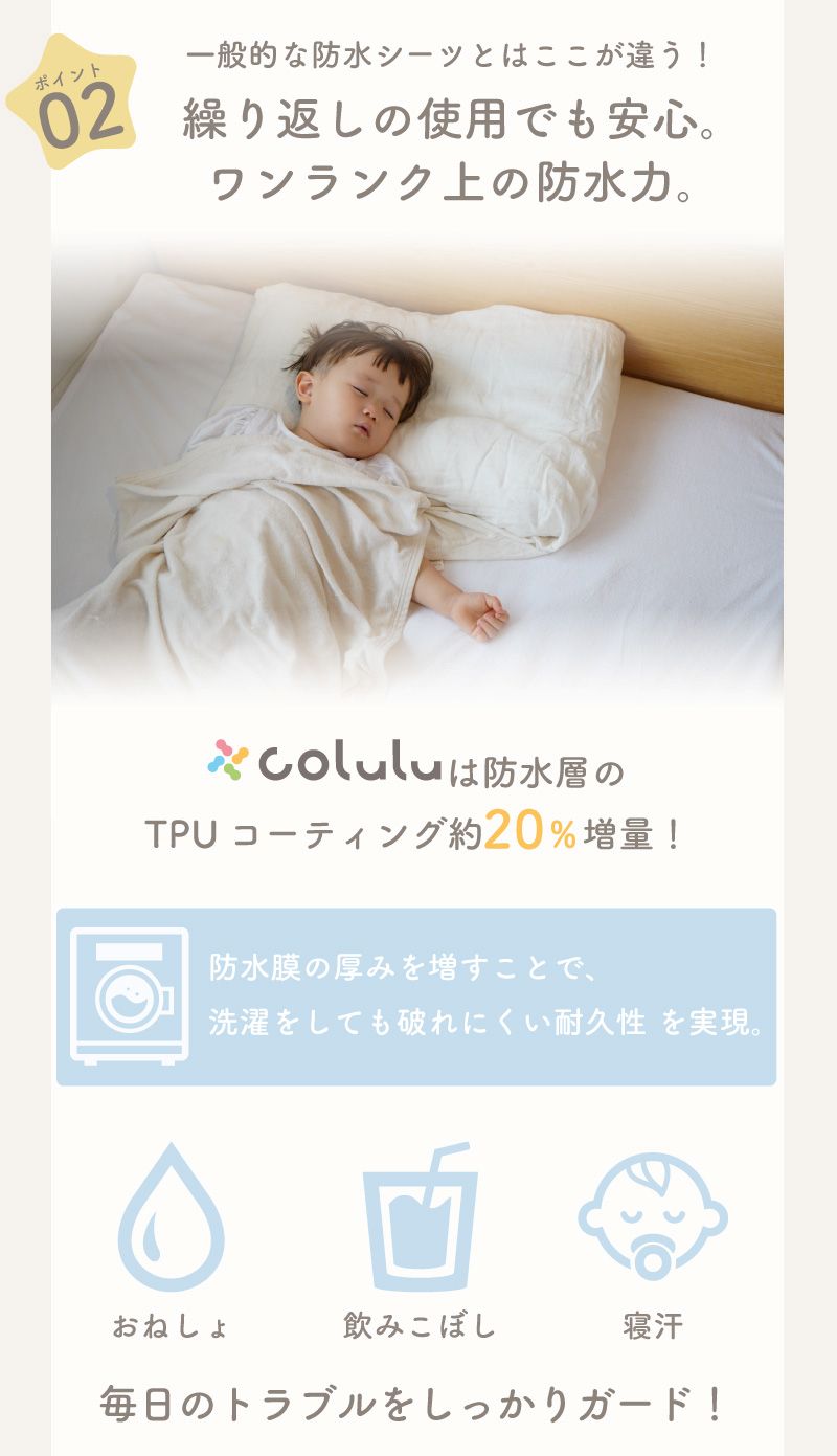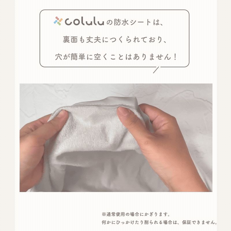 一般的な防水シーツは、洗濯を繰り返すと裏面のコーティングに亀裂が入りがちですが、coluluは高密度基布+耐久性の高いPU防水コーティングを採用。