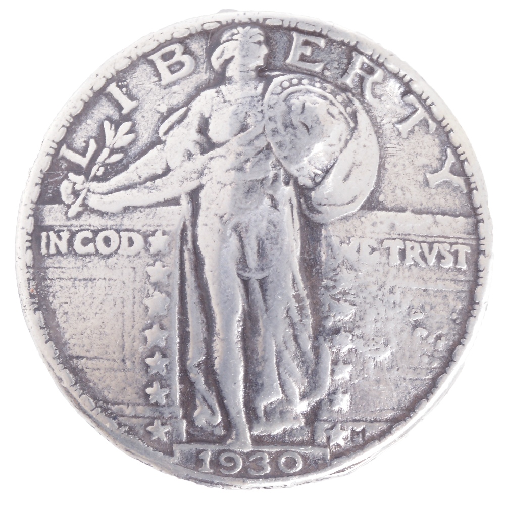 1930年のクォーターコインコンチョのレプリカです。自由の女神を中央配したデザイン。裏面にシカゴスクリュー付き。