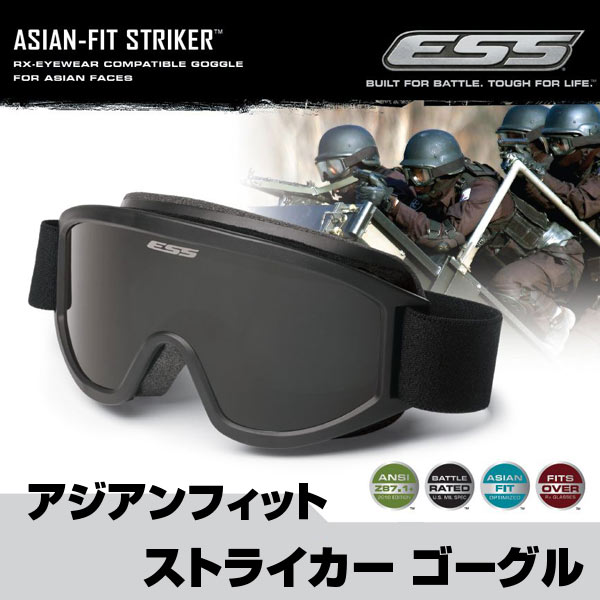 ESSのプロファイル・NVGゴーグル アジアンフィットです。米軍の正式採用品のタクティカルゴーグルで、防弾性能は22口径弾によるインパクトテストをクリアーしています。薄く柔らかいフレームに厚めのウレタンパッドを施すことで小顔な日本人のフェイスラインにピッタリとフィットします。米国国家規格ANSI Z87.1の規格をはるかに超える性能を発揮しています。ゴーグル内に収まる幅のメガネであれば、メガネをかけた上から装着することができます。