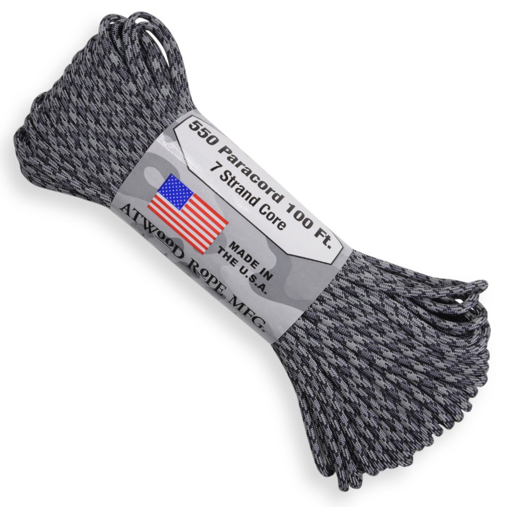ATWOOD ROPE(アトウッドロープ)社製の、光沢感のあるダークグレーと淡い灰色に黒を編み込み、チタンの色をイメージした、Titanium(チタニウム)デザインの550パラコードです。