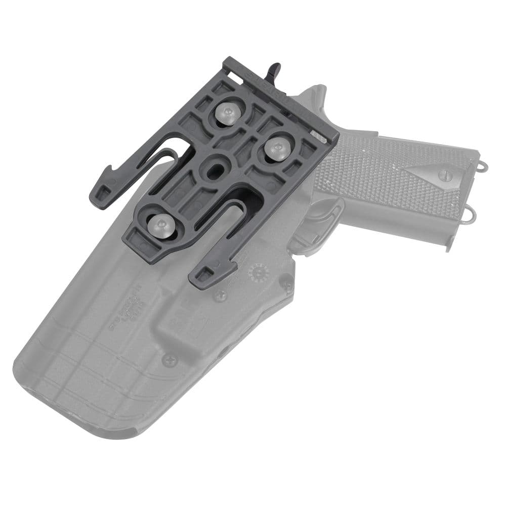 お手持ちの同社製ホルスターに、フォークをそれぞれ取り付けておくと、QLS22付きレッグブラットフォーム(6004272)やベルトプラットフォームに装備でき、腰から太ももにホルスターの移動が簡単に行えます。