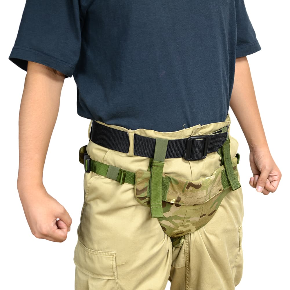 取り付ける際はループ部分にベルトを通し、両サイドのバックルを留めて固定。不使用時はダンプポーチのようにロールアップして腰部に保持できます。