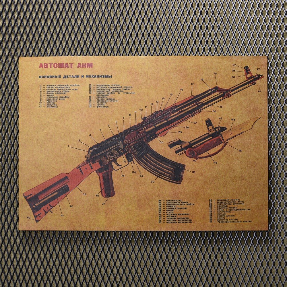 1959年にAK47の後継として旧ソビエト軍に採用されたカラシニコフ式突撃銃、USSR AKMの仕様図が描かれたミリタリーポスターです。