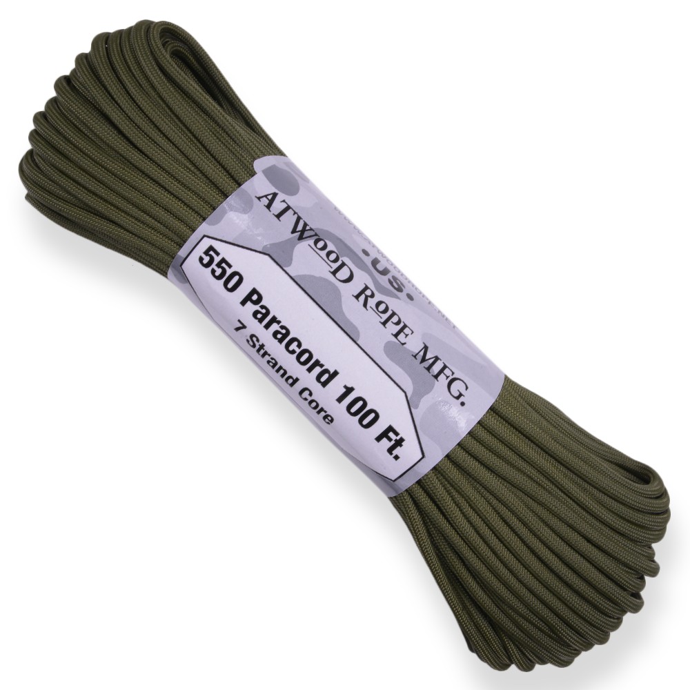 ATWOOD ROPE(アトウッドロープ)社製の、軍車両や軍装備などのミリタリーでは最もよく使われる、Olive Drab(オリーブドラブ)カラーの550パラコードです。