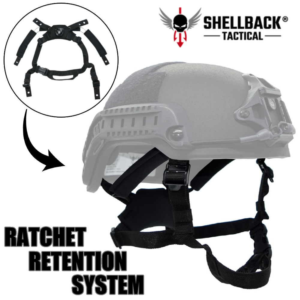 米国の装備品メーカー「SHELLBACK TACTICAL (シェルバックタクティカル)」の「BALLISTIC HELMET RATCHET RETENTION SYSTEM」。近年、軍や法執行機関での採用も多い、ラチェットダイヤル式の4点あご紐です。