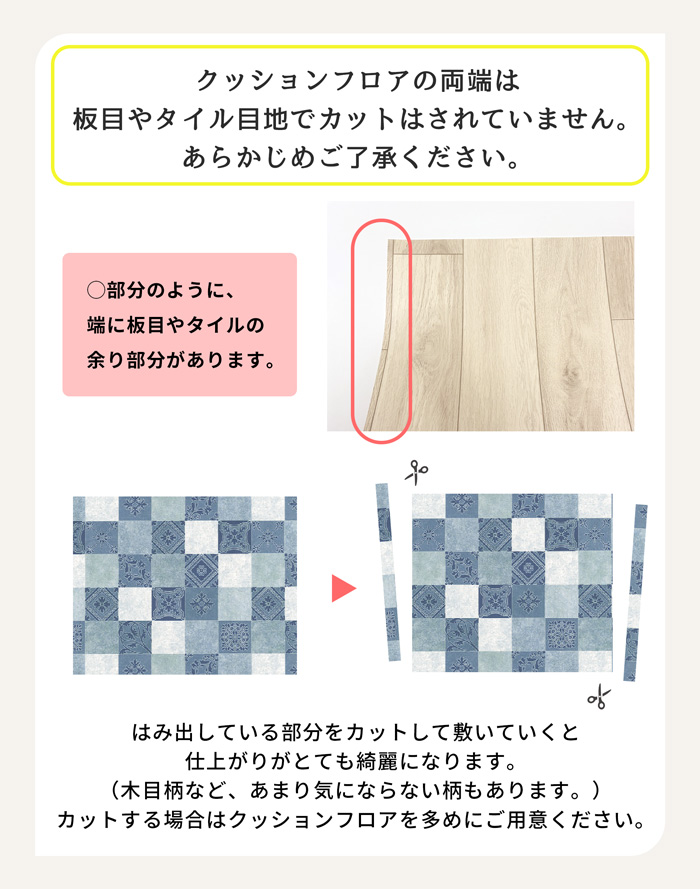 ・凹凸のある床面や端部が浮いてくる時は、クッションフロア用の両面テープ等をご使用ください。