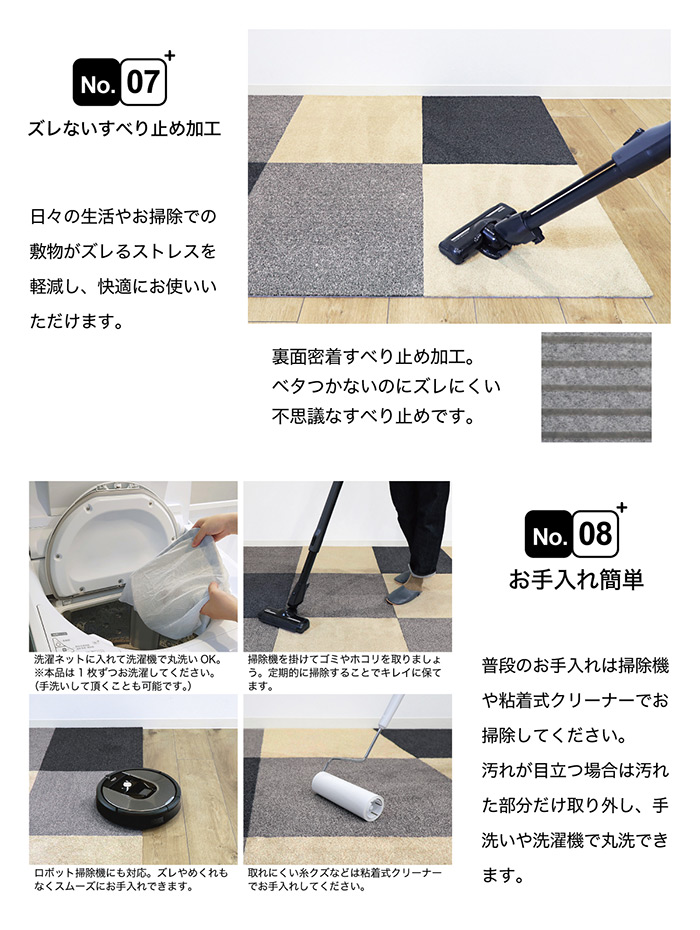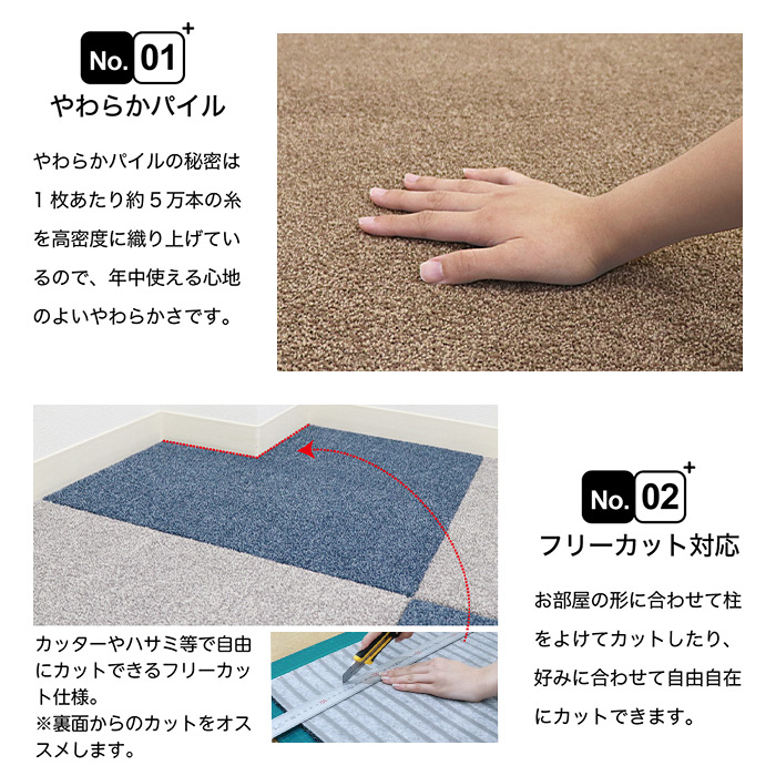 フリーカットができる カッターやハサミの使用する際は十分にご注意ください。カットする際は裏面からのカットをおススメします。カットした際に糸くずが多少出ますが、カーペットクリーナー(コロコロ等)で取り除いてからご使用ください。 洗える 手洗いと洗濯機で丸洗いの両方に対応しています。※洗濯機で洗う際は、洗濯ネットをご使用の上、洗濯してください。 どのシーズンでも使える 季節関係なくお使いいただけます。 床暖房OK 床暖房対応しております。 |