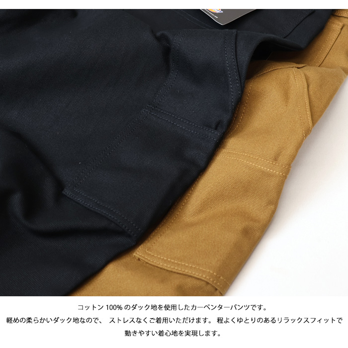Dickiesより#1939MODEL CARPENTER PANTです。 コットン100%のダック地を使用したカーペンターパンツです。 軽めの柔らかいダック地なので、ストレスなくご着用いただけます。 程よくゆとりのあるリラックスフィットで動きやすい着心地を実現します。 サイドにあしらわれたハンマーループがポイント。 1本あると何かと使える定番アイテムです。