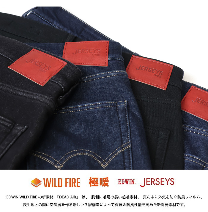 EDWIN WILD FIREの新素材『DEAD AIR』は、肌側に毛足の長い起毛素材、真ん中に外気を防ぐ防風フィルム、表生地との間に空気層を作る新しい3層構造によって保温&防風性能を高めた新開発素材です。表生地にはニットを使用することで、快適なストレッチ性も兼ね備えており、真冬の寒さに最適な素材です。