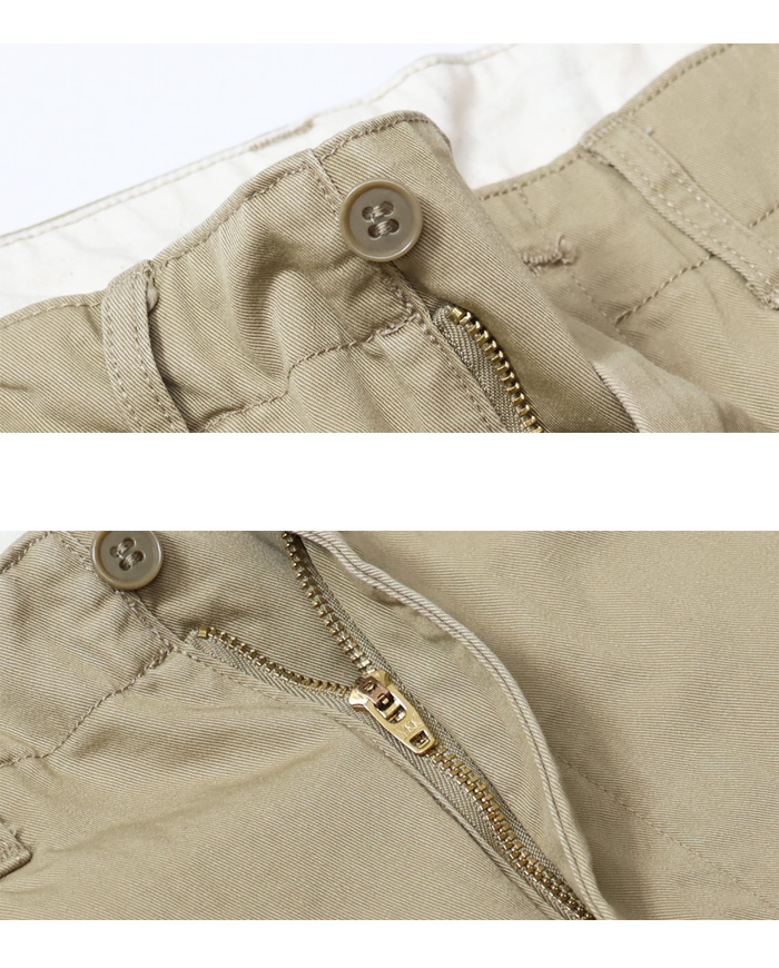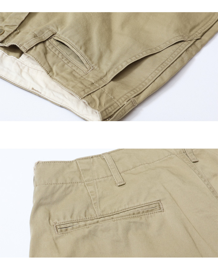 素材にはタテ糸・ヨコ糸を高密度に打ち込んだ上質なヴィンテージチノを採用。生地を地染めした後、表面を顔料で染めることでパンツ全体に凹凸感のあるVintage Chinoならではのユーズド感を表現しました。