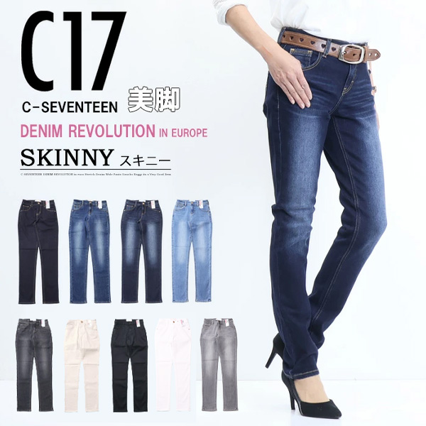 ヒザとスソを絞り過ぎず、美しく脚のラインに沿う、万人向け美脚スキニー。腰回りはフラットフロント&カーブベルトを採用し、しゃがんでも後ろが美しくフィット。穿き心地の良さと安定感に定評がある、C17こだわりの仕様。ヒップの見え方は、ヨーク幅とポケット形・サイズを調整し、余白の少ない見え方で美しい小尻見えを叶えてくれます。