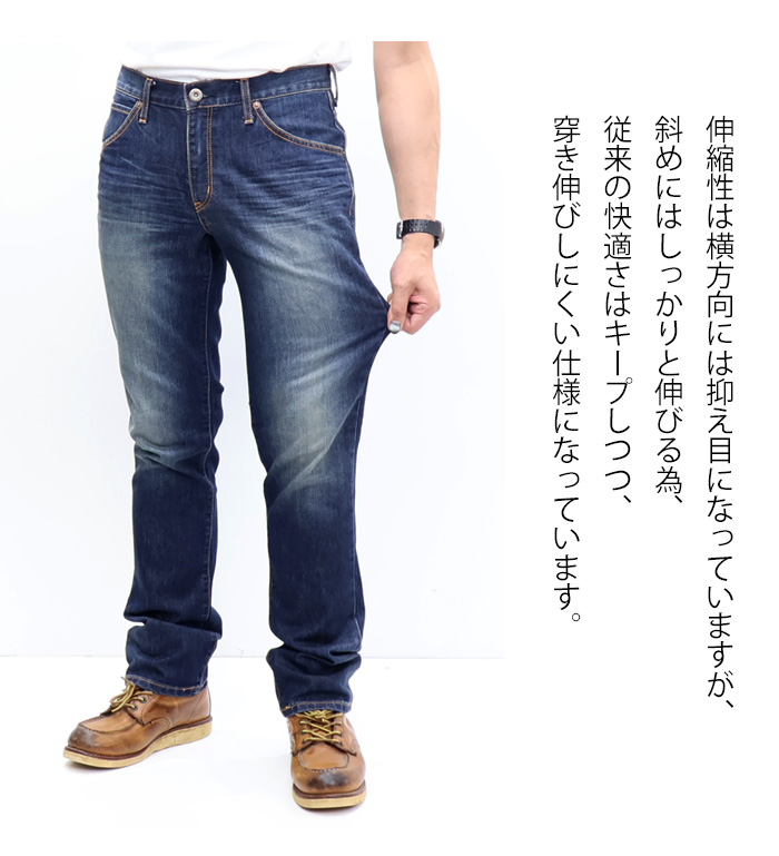 デニムは少し光沢感があり、高級感のある見た目にアップデート。伸縮性は横方向には抑え目になっていますが、斜めにはしっかりと伸びる為、従来の快適さはキープしつつ、穿き伸びしにくい仕様になっています。