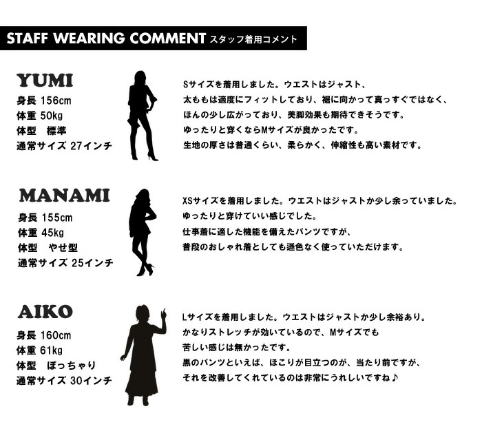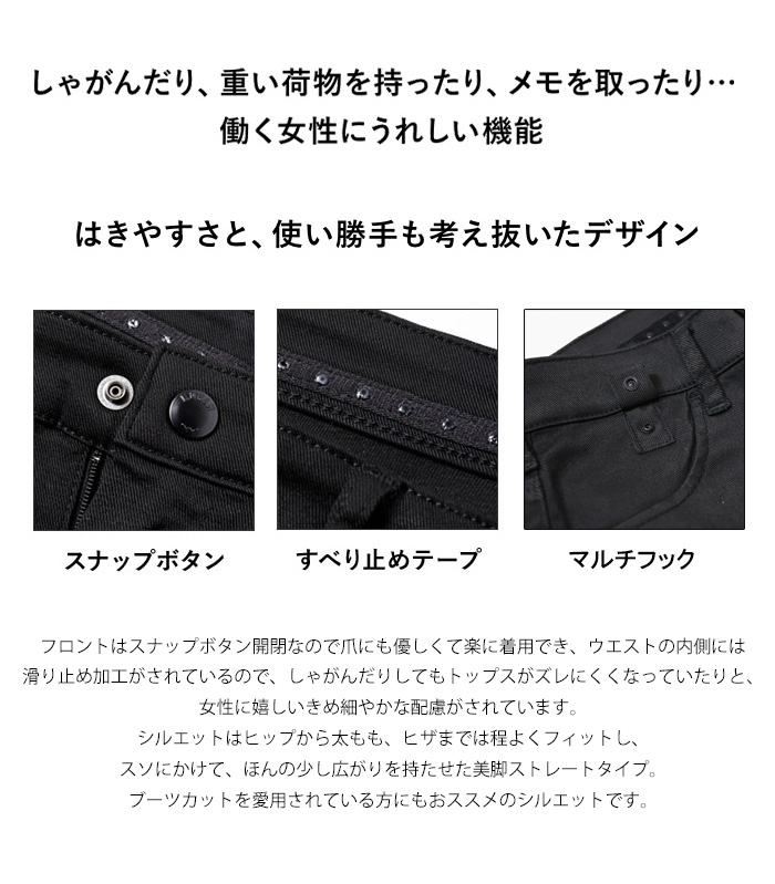 どんな場面でも役立つオールマイティーな一本です。 フロントはスナップボタン開閉なので爪にも優しくて楽に着用でき、ウエストの内側には滑り止め加工がされているので、しゃがんだりしてもトップスがズレにくくなっていたりと、女性に嬉しいきめ細やかな配慮がされています。