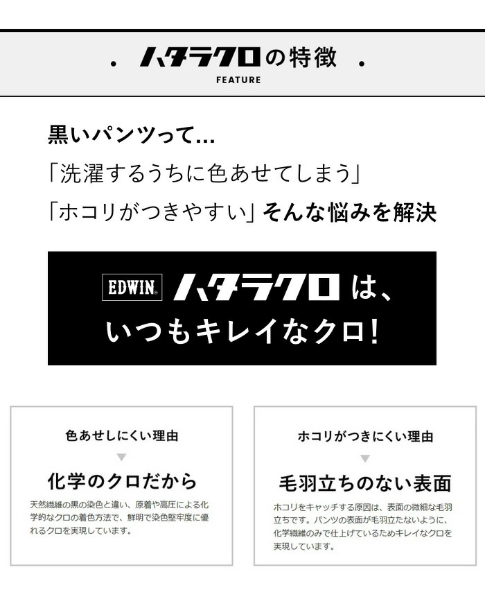 仕事用としても穿ける黒パンツは「ほこりが付くと目立つ」「毎日穿いているとすぐ色が褪せてしまう」 という悩みを解決してくれるパンツです。