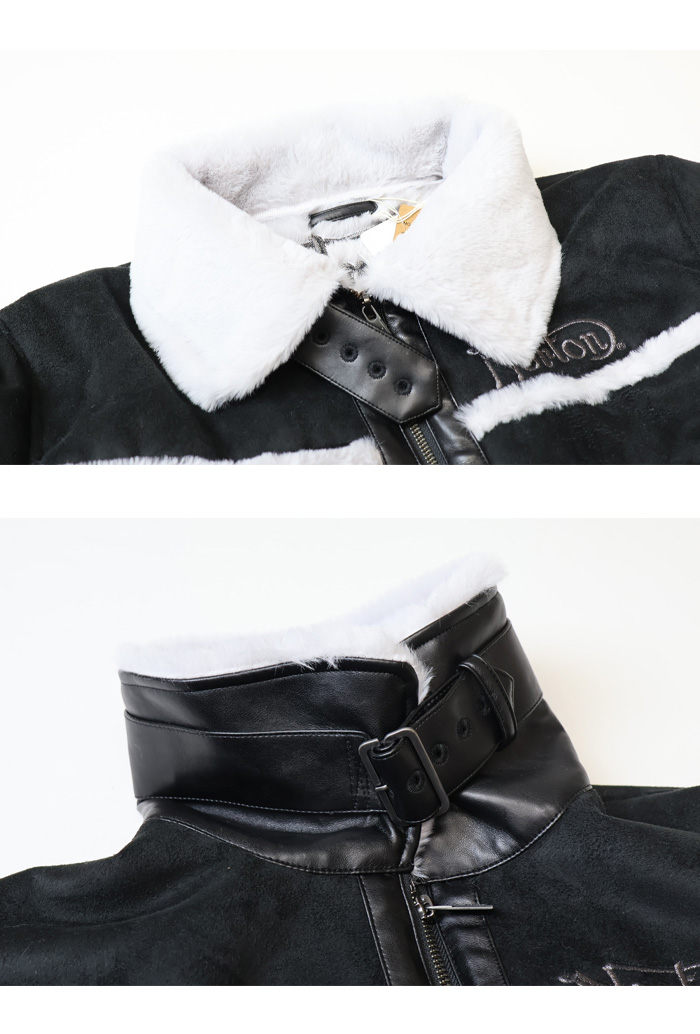 フライトジャケットの定番『TYPE B-3』をモチーフに、柔らかくて着心地の良いフェイクムートンで仕上げたタウンユースに最適な一着!胸、背中、袖のロゴデザインは全て刺繍で施された豪華な仕様になっており、派手過ぎないクールなデザインでありながら抜群の存在感を誇っています。裏ボア仕様なので防寒性も高く、軽い着心地ながら冬のアウターとして十分に活躍してくれる一着です。