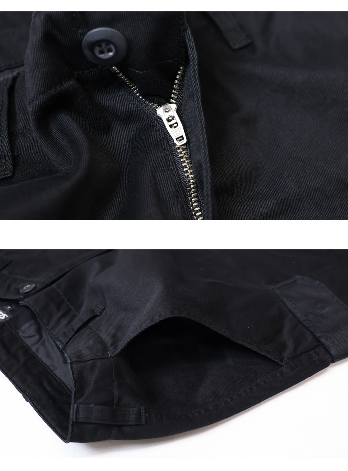 32/2×10の打ち込みの良いウエポンを使用したカーゴパンツ。M-51ベースのシルエット感で作成しており、サイズ感は太目。カーゴポケットとヒップポケットはフラップが付いた王道デザイン。裾はドローコードが付いており、調節が可能です。