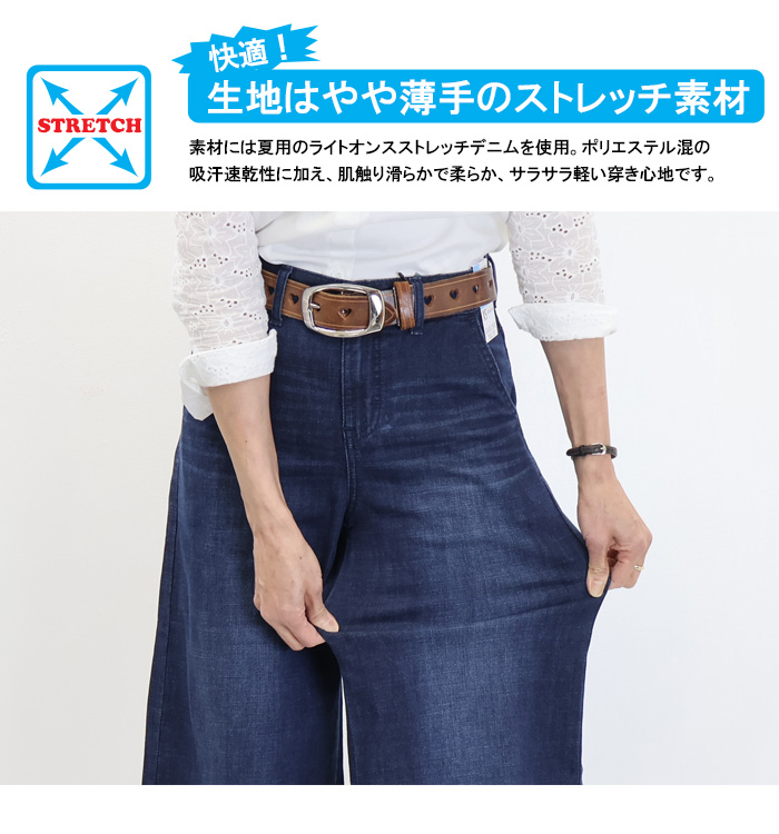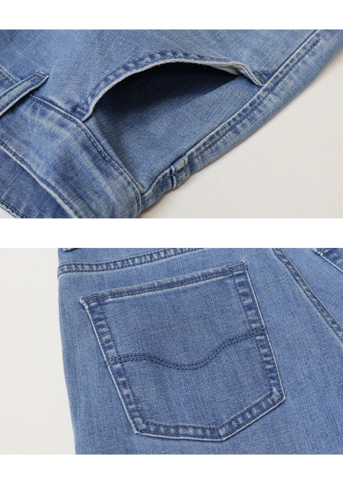 デニムカラーともにストレッチ性に優れ、軽くて柔らかい穿き心地の抜群の素材を採用。ドライタッチで蒸れにくく、暑い季節も涼しく快適に過ごせます。
