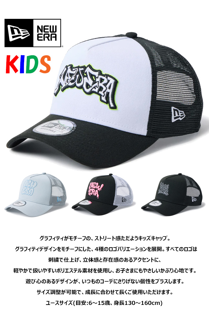グラフィティがモチーフの、ストリート感ただようキッズキャップ。 グラフィティデザインをモチーフにした、4種のロゴバリエーションを展開。すべてのロゴは刺繍で仕上げ、立体感と存在感のあるアクセントに、軽やかで扱いやすいポリエステル素材を使用し、お子さまにもやさしいかぶり心地です。遊び心のあるデザインが、いつものコーデにさりげない個性をプラスします。サイズ調整が可能で、成長に合わせて長くご使用いただけます。シルエットは9FORTYをベースに、フロント部1枚パネルにして上部をつまんだ独特のシルエットが特徴。 フロントパネルの内側に独自の芯を作ることで型崩れしにくいシルエットが保たれます。少し深みがある被り心地です。 ユースサイズ(目安:6〜15歳、身長130〜160cm) バイザー(つば)はあらかじめ着用しやすい状態にカーブしています。