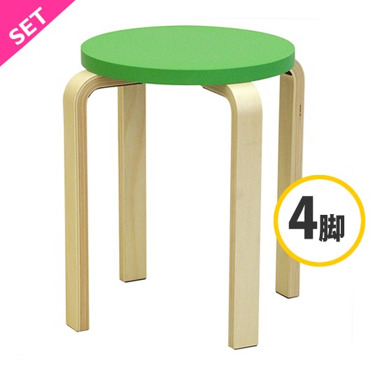 ナチュラルウッドの脚部にポップなグリーンの座面がアクセントの木製ラウンドスツール4脚セット。座面直径は340mm、脚裏には床のキズ防止用にフェルトが貼ってあります。4脚までスタッキングできます。