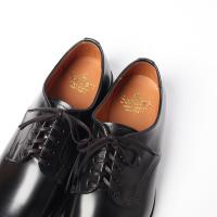 アッパーはポリッシュドレザー仕様。光沢感をがあり傷や汚れが付きにくく、比較的雨にも強いのが特徴です。ブラッシングの後、少量の水を含ませた柔らかい布で磨いて頂くと光沢感が保てます。簡単にお手入れができるため、革靴を初めて履く方へもおすすめです。