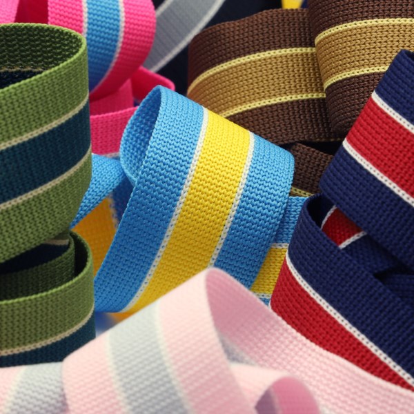 SHINDO社製(S.I.C.)のニットラインテープです。薄手の3色ストライプ柄(2色ストイプに見えますが、中央カラー両サイドにアクセントカラーが配されています)の片面ニットテープで、適度な伸縮性がありジャージーなどのストレッチ性のある生地との相性が良くオススメです。