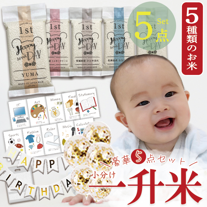 一升餅 一升米 1歳 お祝い 名入れ ギフト 男の子 女の子 小分け 豪華5点セット 『選び取り セット×風船ガーランド**2合×5銘柄食べ比べ』 一升餅の代わり