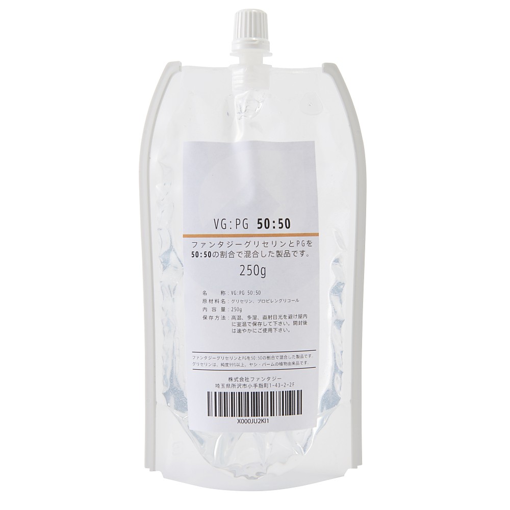 ファンタジーグリセリン(VG)とプロピレングリコール(PG)を50:50でミックスした製品です。容量は、250gです。